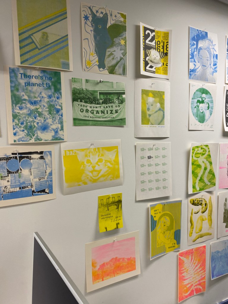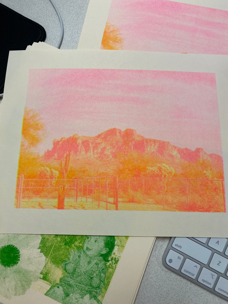 some quick photos from a Risograph printing workshop led by Yasmeen Abedifard at the Berkeley Art Studio in July – I printed the 2nd and 3rd images from photos and collage of home / the Superstition Mountains. Prints on the wall in the 1st image are by other students! Excited to return to this to try with more ink colors