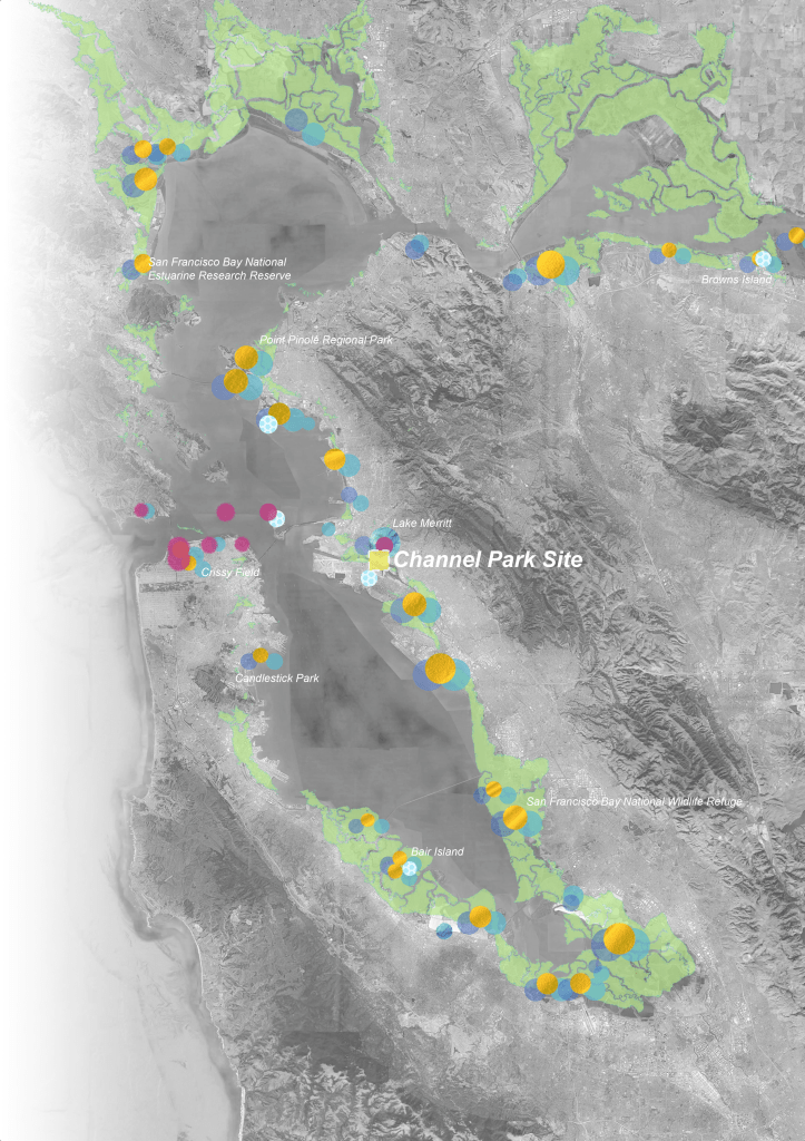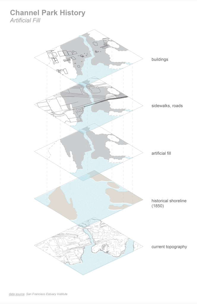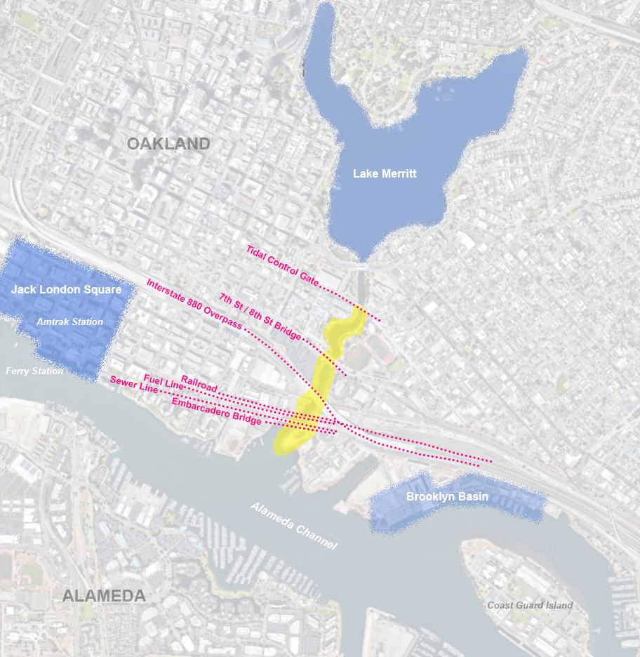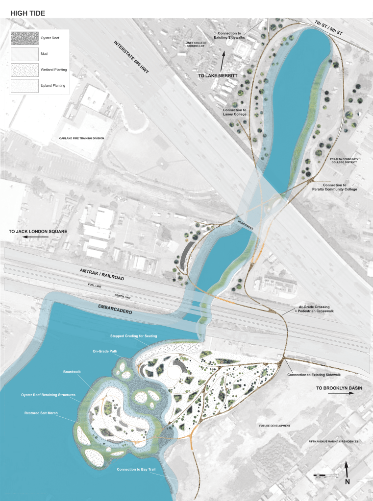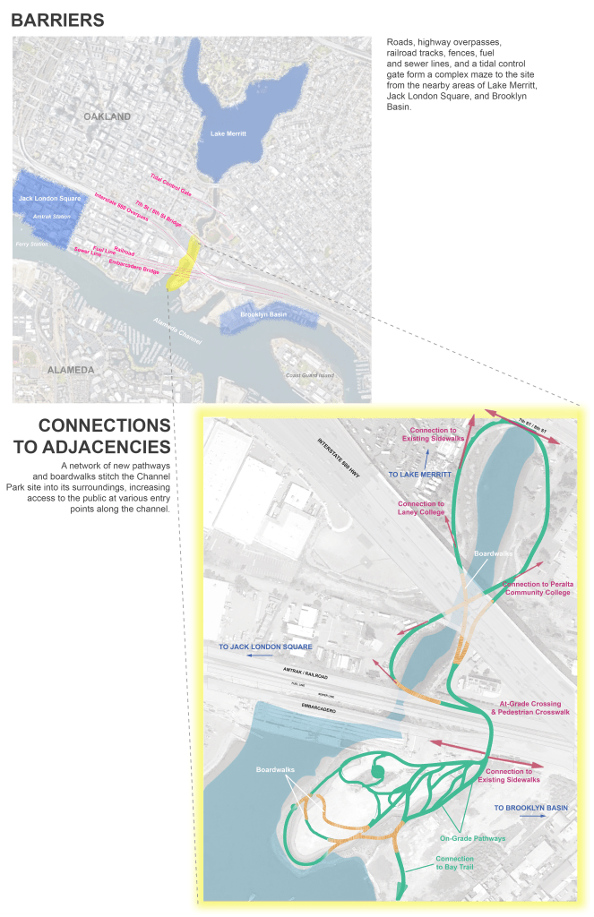 Because Channel Park is located downstream of the tidal control gates that maintain the lake’s water level, the site is subject to tidal flux in a way that Lake Merritt is not. Additionally, despite its close proximity to Lake Merritt, the site is disconnected from the spirit and activity of the area due to a series of infrastructural barriers imposed on the landscape over many decades. Railways, roads, pipelines, and the Interstate 880 overpass segment the landscape leading to Channel Park, isolating it as a metaphorical island in context with its urban adjacencies, and making it difficult to access for those traveling from surrounding areas.