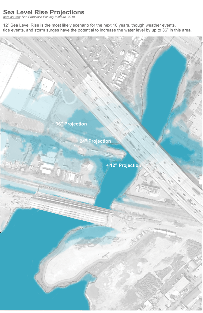Prior to the filling and dredging of the bay that came with colonization of the 1800’s, this channel was historically wider and mainly consisted of rich and biodiverse tidal marsh. Looking forward, we can see that sea level rise projections predict that the channel will return to its historical state of inundation, overturning on the impermeable surfaces currently in-place, as is shown in this graphic.