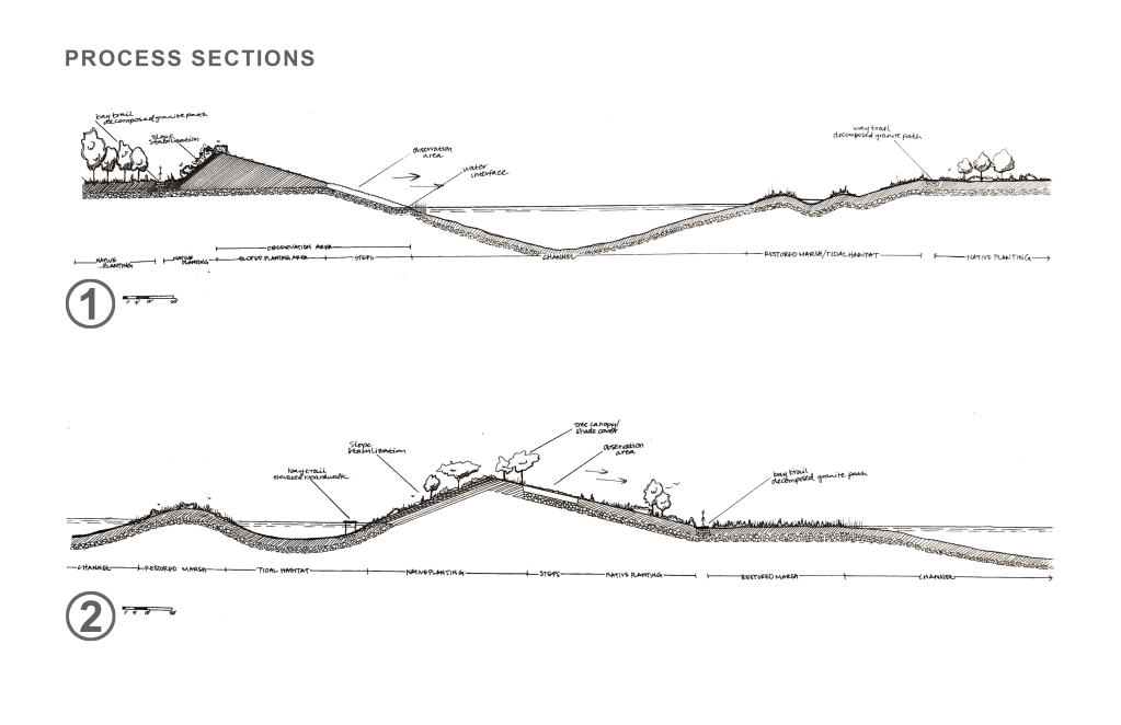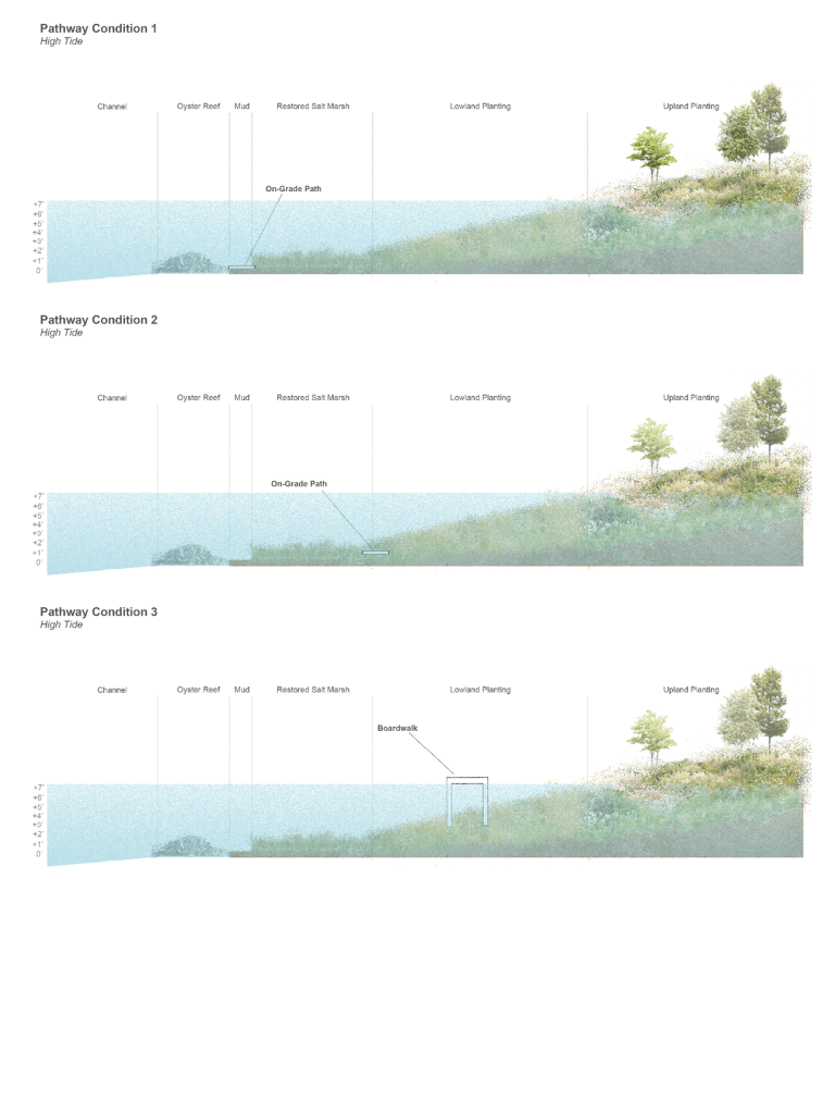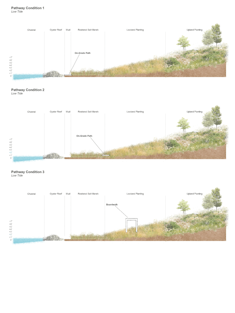 This landscape plan includes on-grade pathways and boardwalks that meander through the graded forms. The various pathway conditions offer different opportunities and means of access to certain islands depending on the time of day as tides allow. The multiple route options across the landscape encourage visitors to slow their pace, wander, and observe how it changes over time.