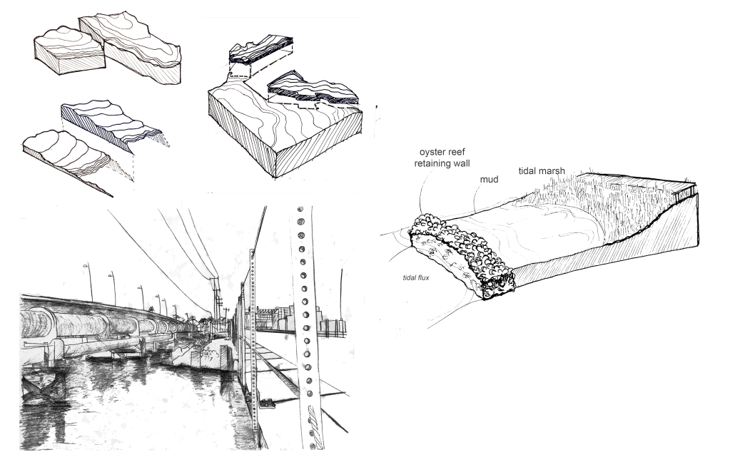At low tide, the oyster structures may be revealed, followed by zones of mud, tidal marsh, lowland planting, and upland planting, as is exhibited in the plans below.