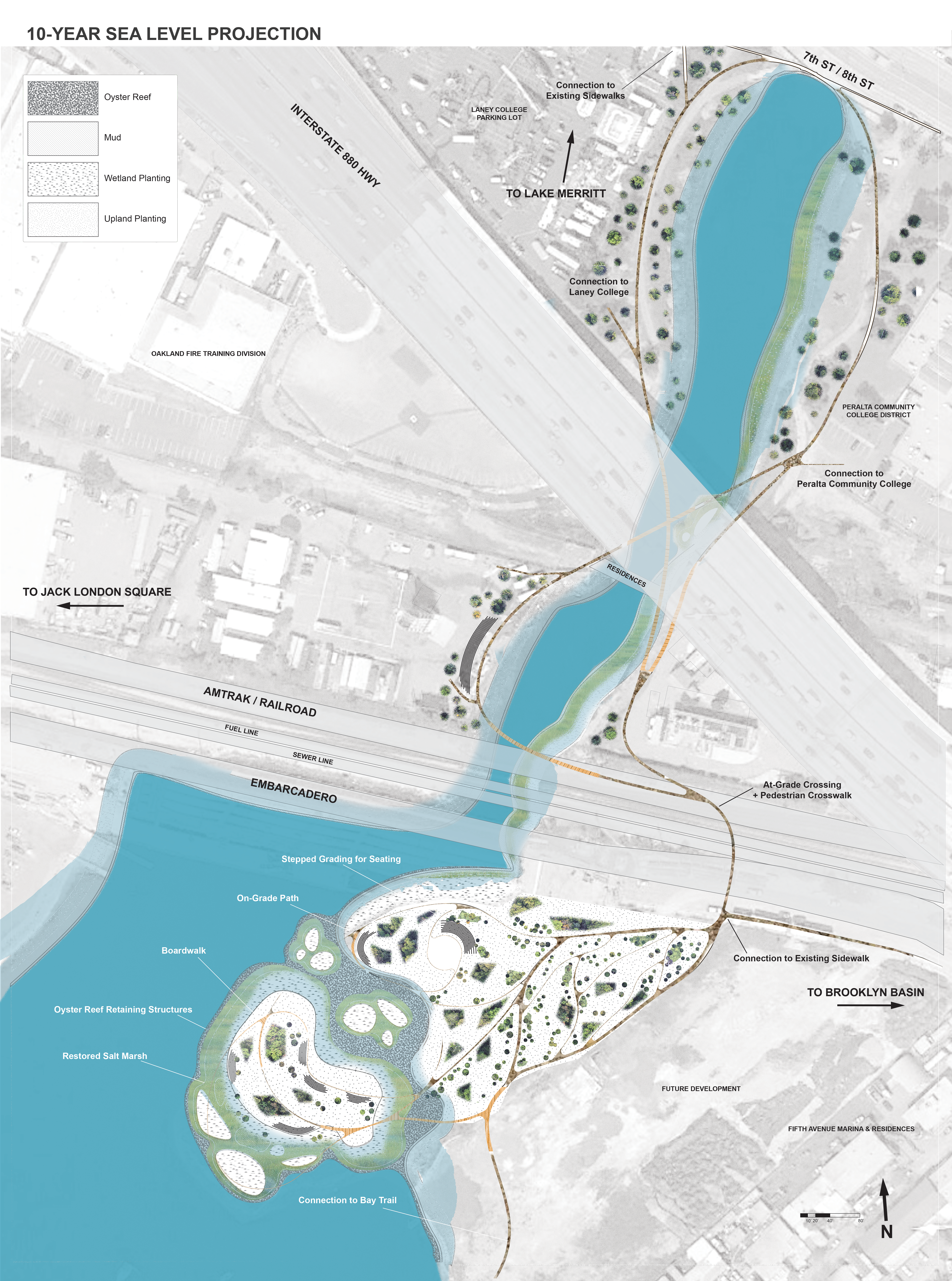 Because Channel Park is located downstream of the tidal control gates that maintain the lake’s water level, the site is subject to tidal flux in a way that Lake Merritt is not. Additionally, despite its close proximity to Lake Merritt, the site is disconnected from the spirit and activity of the area due to a series of infrastructural barriers imposed on the landscape over many decades. Railways, roads, pipelines, and the Interstate 880 overpass segment the landscape leading to Channel Park, isolating it as a metaphorical island in context with its urban adjacencies, and making it difficult to access for those traveling from surrounding areas.